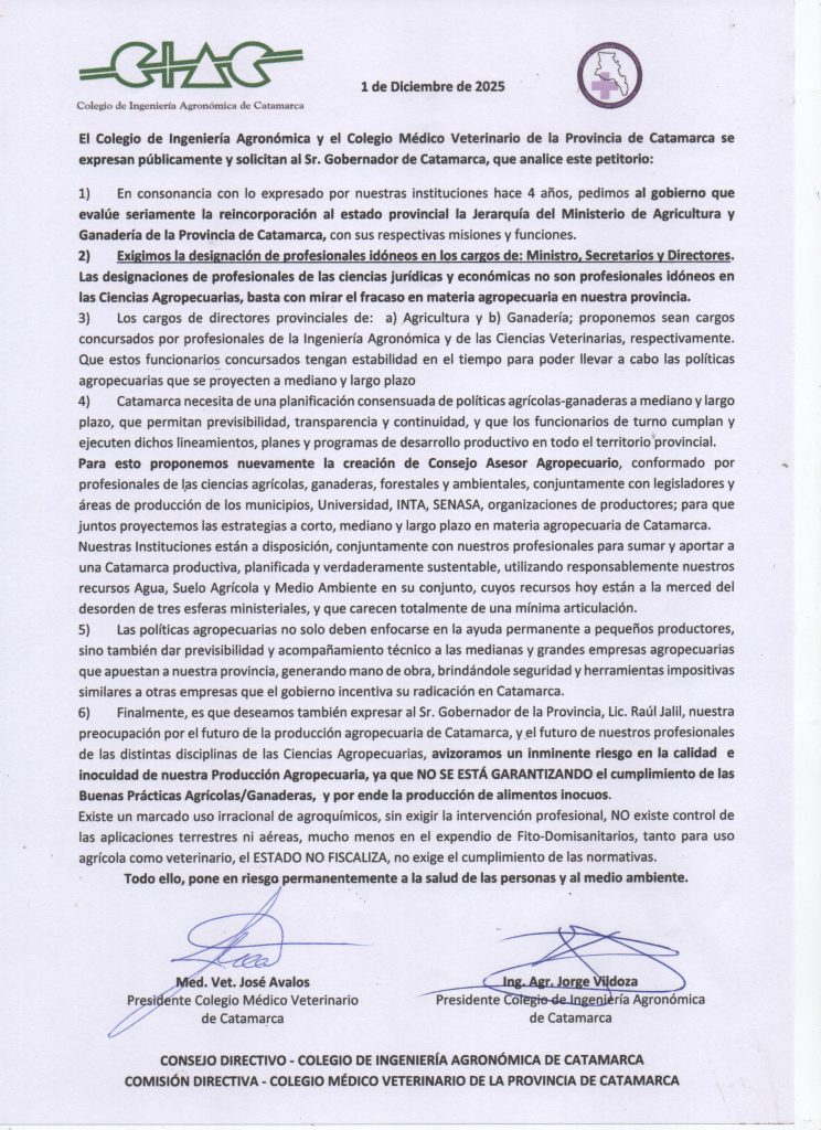 En el día de hoy se estará enviando a los medios de comunicación el siguiente Petitorio Público, que simultáneamente se envía al Sr. Gobernador de la Provincia, Lic. Raúl Jalil, acompañado de una nota por la cual solicitamos una reunión formal para expresarle personalmente los motivos y demás temas que desencadenan el mismo, ya que consideramos necesario ofrecerle detalles sobre nuestra visión profesional, que está afectando la Calidad Productiva de nuestra provincia de Catamarca.